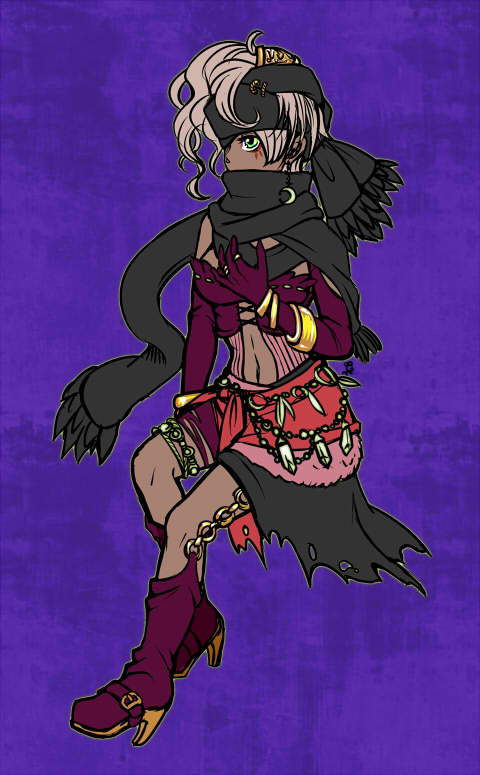 カラーとか装飾暫定ですが、こちらはキャラデザお題ったーで、【マフラー】【月】【カラス】を要素や衣装モチーフとした、【盗賊】って事で。盗賊ちゃんです。